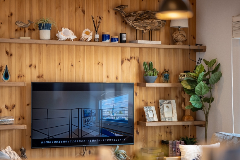 カリフォルニア・マンハッタンビーチの街並みをイメージした白い塗り壁とウッドの外観。落ち着きのある佇まいに、ターコイズブルーの玄関ドアでアクセントをプラス。