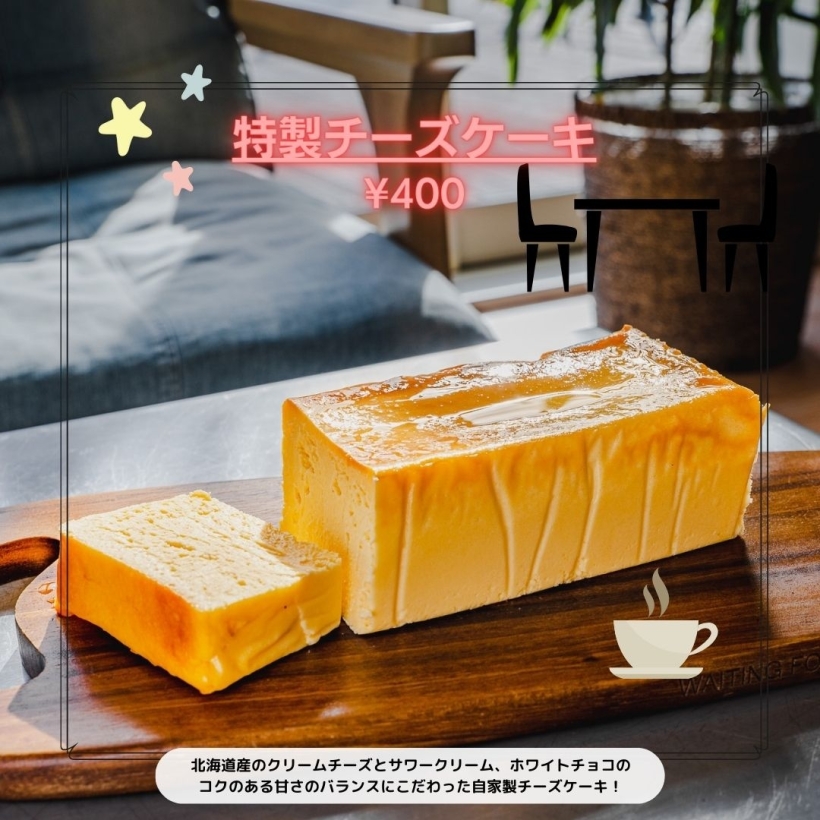 ----特製チーズケーキ---- 北海道産のクリームチーズとサワークリーム、ホワイトチョコのコクのある甘さのバランスにこだわった自家製チーズケーキ!