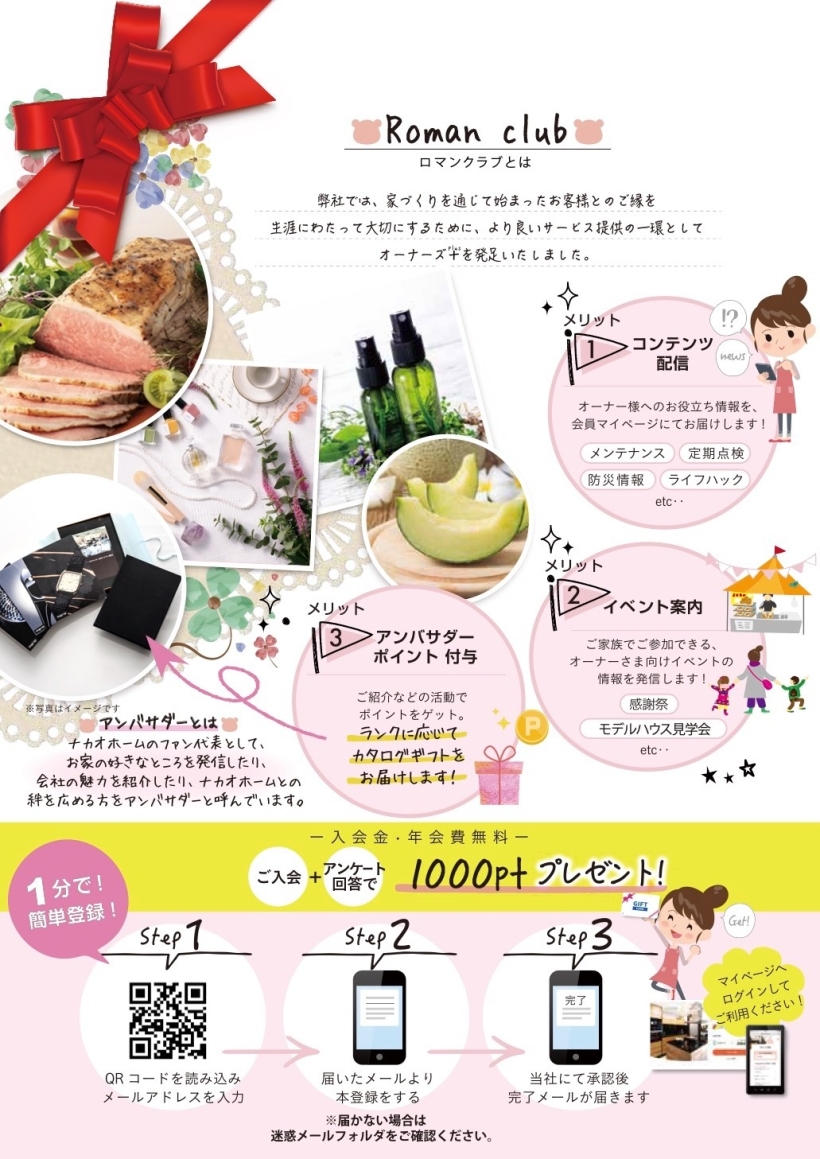 ロマンクラブにご入会されているオーナー様はご存知かもしれませんが、ロマンクラブにご入会されると沢山の特典が付いてきます。 ロマンクラブとは、家づくりを通じて始まったお客様とのご縁を生涯にわたって大切にするために発足されたサービスです。
